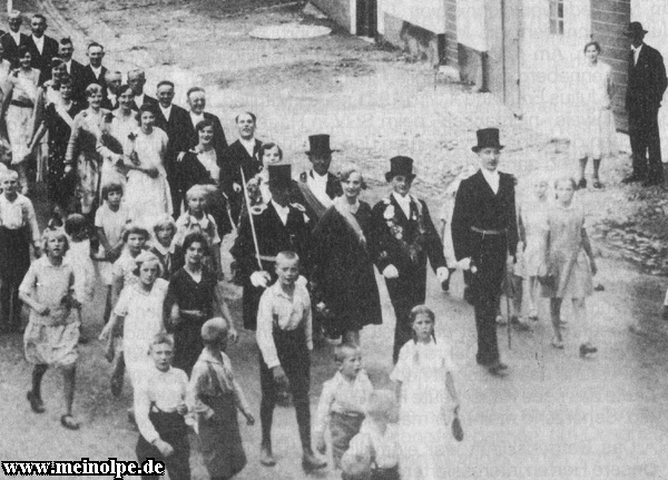 Drei Angehörige der jüdischen Familie Jacob in Lenhausen beim Schützenzug 1932: Erich Jacob als Schützenkönig, die Damen Henny und Else Jacob in der 3. und 4. Reihe. Im Unterschied zu anderen Orten konnten in Lenhausen jüdische Bürger Mitglied des Schützenvereins sein. |