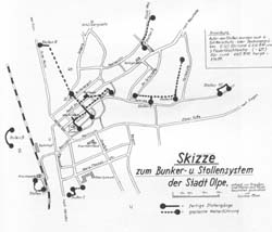 Am 24. Februar 1944 fand im Olper Rathaus eine Besprechung über den Luftschutzstollenbau im Kreise Olpe statt, zu der Kreisleiter Neuser die maßgebenden Behördenleiter geladen hatte. Seit 1943 war Kreiskulturbaumeister Josef Schulte technischer Beauftragter für Luftschutzbauten im Kreisgebiet. Dieser legte anhand aufgestellter Nivellements die Linienführung der in Olpe zu bauenden Hangstollen fest. Die Bauarbeiten begannen, nachdem Gelder und Baumaterial bewilligt waren, durchweg im Spätsommer 1944. Sprengstoff war sehr schwer zu beschaffen. Bohrmaschinen, Kipploren und Schienenanlagen mussten "organisiert" werden. Sie wurden von der Grube in Meggen (Sachtleben AG) entliehen oder an Baustellen beschlagnahmt. Als Fachleute für die Bohr‑ und Schießarbeiten arbeiteten Meggener Bergleute, die durch eine Anzahl russischer Kriegsgefangener aus Olper Fabriken unterstützt wurden. Eine geologische Untersuchung im November ergab, dass in den meisten Füllen das Deckgestein aus weichem, manchmal kalkhaltigem Schiefer bestand. Es fehlte demnach ein unzerklüfteter Grauwackefelsen, der mit neun Metern Oberdeckung sicheren Schutz vor jedem Bombeneinschlag geboten hätte. |