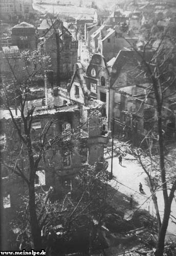 Schäden Schon in den Monaten April / Mai 1945 stellten sieben von der Stadtverwaltung beauftragte Architekten und Bauunternehmer in den ihnen zugewiesenen Stadtbezirken die Gebäudeschäden fest. Bei 9996 Einwohnern ‑ ohne die Insassen der Lazarette, eingeschlossen aber 2991 Evakuierte ‑ gab es 1749 Wohnungen. Von den 1000 Häusern waren 367 unzerstört, 354 wiesen nur Glasschäden auf, 135 waren leicht beschädigt, 35 zwar mittelbeschädigt, aber noch bewohnbar, 55 stark beschädigt und unbewohnbar, 54 waren total zerstört. Diese Gebäude lagen ‑ in der Reihenfolge des Zerstörungsgrades in folgenden 12 Straßen: Im Weiherohl, Bergstraße, Auf der Mauer, Bahnhofstraße, Kölner Straße, Martinstraße, Am Stötchen, Frankfurter Straße, Kurfürst‑Heinrich‑Straße, Bruchstraße, In der Wüste und Mühlenstraße. Etwa 9 ha, das waren 7,3% der Siedlungsfläche von 1945 (etwa 123 ha), waren von Bomben getroffen worden. In dieser Statistik fehlen die Schäden am Straßen‑ und Versorgungsnetz, an Telefonleitungen und sonstigen öffentlichen Einrichtungen sowie die Flurschaden. |
