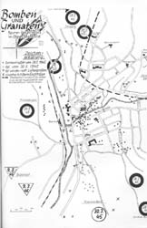 Rechte Seite: Alle Sprengbomben‑Einschläge sind nach amtlichen Unterlagen und ergänzenden Zeugenaussagen eingetragen worden. Trotz gewissenhafter Erkundigung war es unmöglich, in der Skizze jeden Treffer zu berücksichtigen oder genau zu lokalisieren . Brandbomben und andere Abwurfmittel wurden nicht eingezeichnet, weil sie im Vergleich zu den Sprengbomben kaum Schaden angerichtet haben. ‑ Einschläge einzelner Artilleriegeschosse sind nur dann vermerkt, wenn sie im Text eigens erwähnt wurden