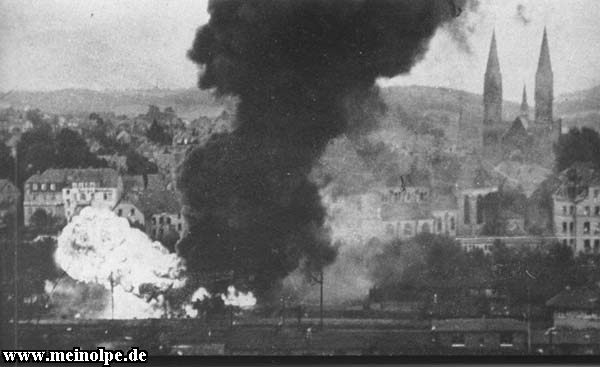 28. September 1944, im Bahngelände brennt ein Treibstoffzug