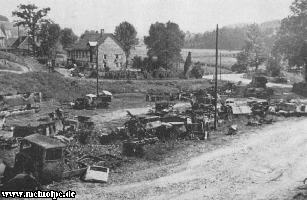 Heeresgut und zerschossene Fahrzeuge bei Rüblinghausen